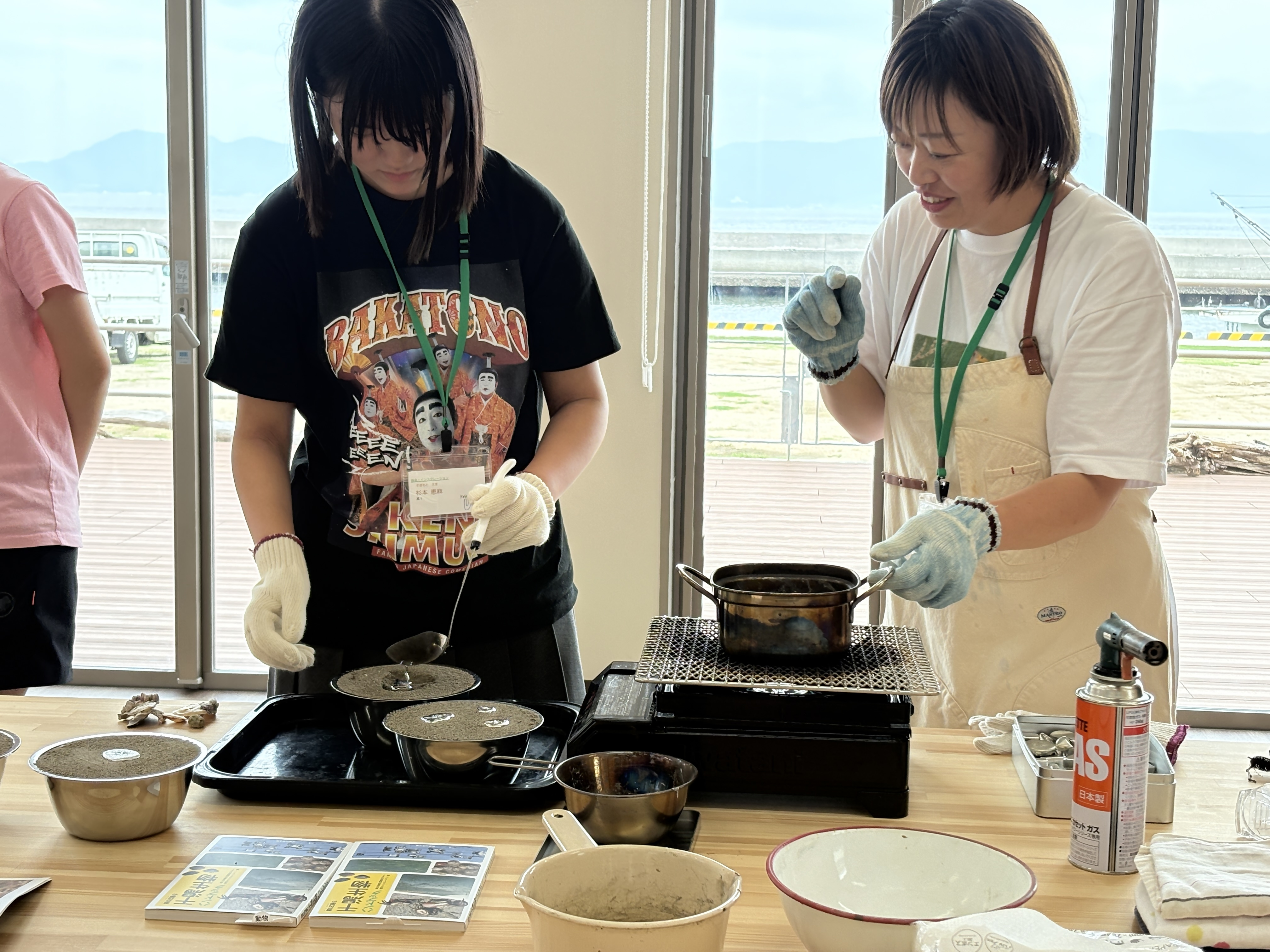 集めた素材はその後、砂で型を取ります。火にかけた鍋で錫を溶かし、型に流し込む鋳金の作業は初めての挑戦。最初に取り組んだ高校2年の村尾優佳さんは「あまり外に出ないので、自然に触れられて楽しかった」と笑顔。同じ学校で油絵やデザインの勉強をしているという福田美羽さんも、普段はできない経験を楽しんでいました。