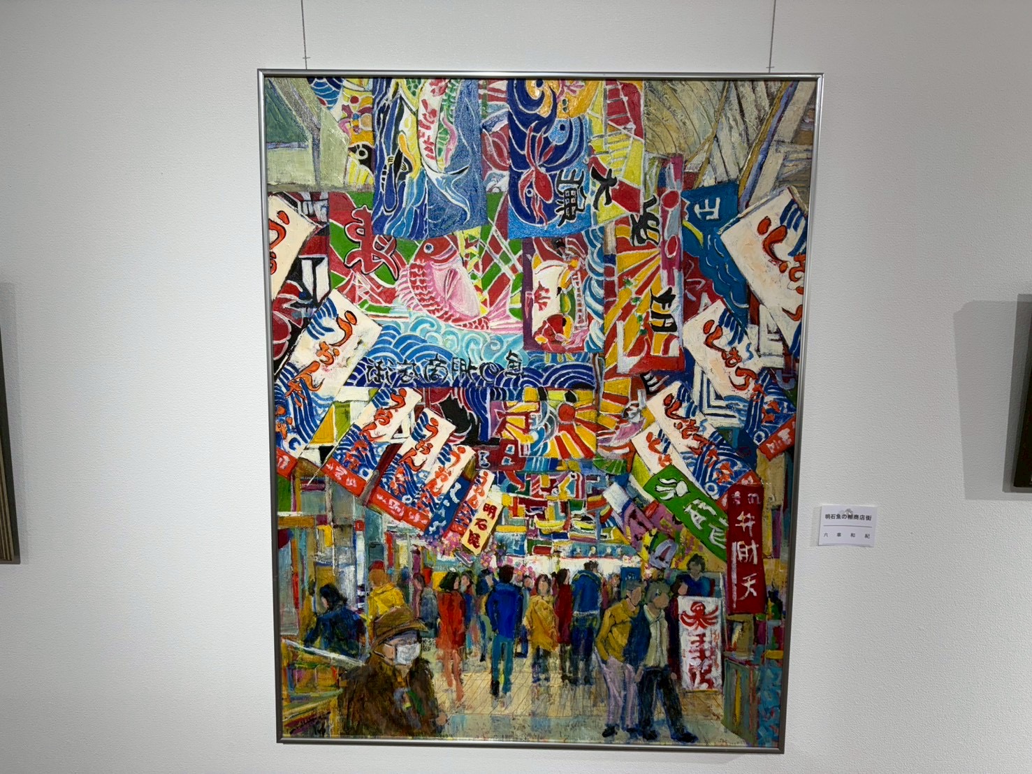 油絵を中心に描く六車さんの作品には、日常の中にある“記憶の風景”が詰まっています。今回展示されたのは、姫路旅行の際に見かけた色鮮やかな大漁旗が目を引く「明石魚の棚商店街」や、「滝宮橋」などの橋シリーズ。現場で撮影や簡単なスケッチを行い、自宅で再構成しながら少しずつ作品を仕上げていくスタイルです。