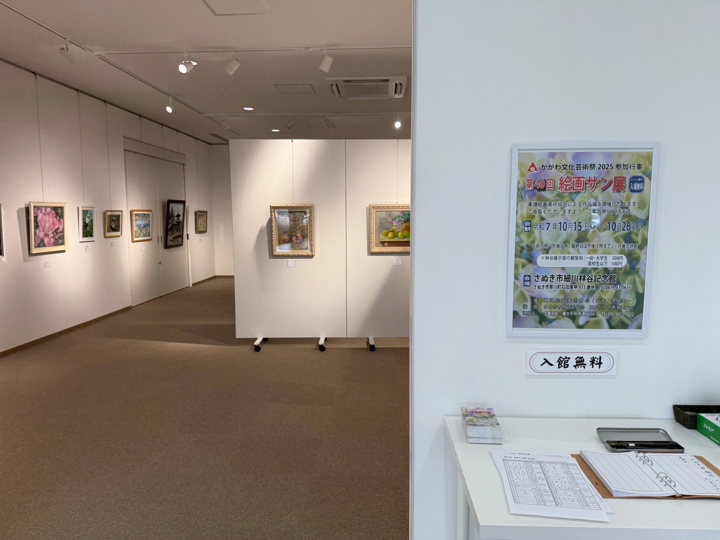 2025年10月15日から26日まで、香川県さぬき市にある細川林谷記念館において、地域の画家らによる作品展が開催されました。この「第40回 絵画サン展」では、さぬき市・東かがわ市に在住・活動する絵画作家19名による油彩画、水彩画、日本画、墨彩画など、大作・小品あわせておよそ50点の個性豊かな作品が並びました。