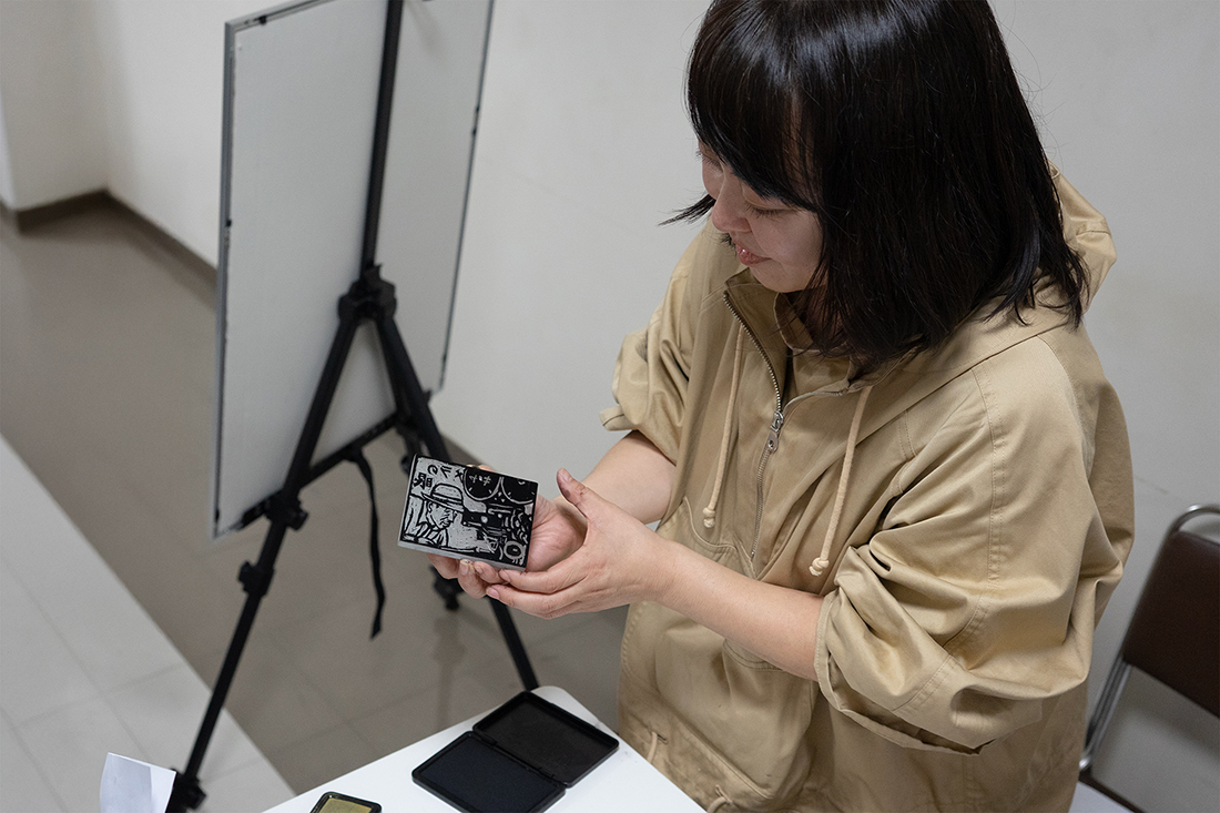 趣味の消しゴムはんこで、小津監督とヒロインの原節子さんを表現してくれた香西監督。上映後、参加していた方に監督自らスタンプしてくれるサービスも!