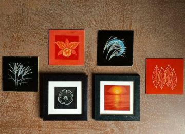 香川の3技法である彫漆の技法を用いた漆額を作ります。彫漆は色漆を数十回から数百回塗り重ねて色漆の層を作り、その層を彫ることで文様を浮き彫りにする技法です。彫る深さによって色合いが変わることで、自分だけのオリジナル漆額が作れます。作品は額縁に入れてお持ち帰りできます。