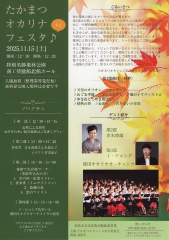 第1部は県内外のオカリナ愛好家による演奏、第2部は箏奏者青木香璃氏を迎えてオカリナ古市晶子とコラボ演奏を行います。続く第3部は客席にて大合奏を行い、第4部は韓国よりイビョング氏率いる韓国オカリナオーケストラの演奏をお届けします。