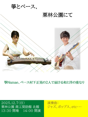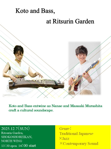 箏奏者Nanae、ベーシスト村下正晃でお届けするコンサート。栗林公園内の商工奨励館北館にて、美しい北庭を背景に和文化と洋文化の重なりをジャズ、ポップス、唱歌などで表現します。