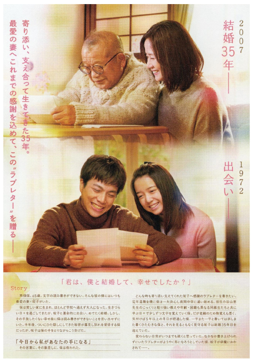 西畑保、65歳。文字の読み書きができない。そんな彼のそばにはいつも最愛の妻・皎子がいた。どんな時も寄り添い支えてくれた皎子に感謝のラブレターを書きたい。定年退職を機に夜間中学に通い始める。同級生たちと共に学ぶ日々で少しずつ文字を覚えていく保。老齢の為に物覚えも悪く気づけば5年以上の月日が経過していた。書いてはまた消し書くひたむきな保と見ることもなく見守る皎子は結婚35年目を迎えていた。ようやくラブレターが形になろうとしていた頃、皎子が病魔におかされて...。