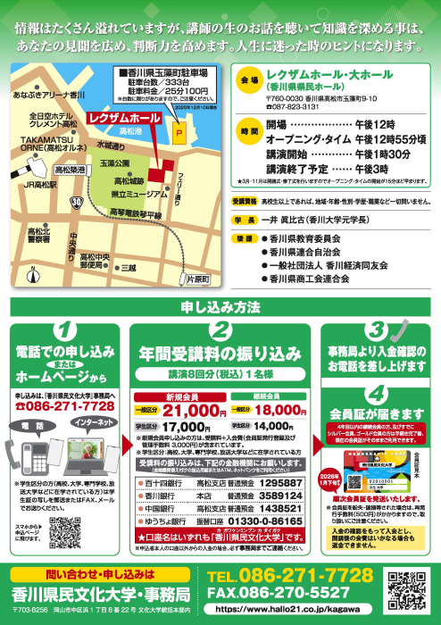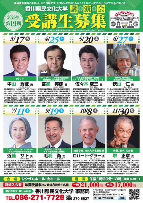 香川県民文化大学は、一般市民を対象に、高齢化・国際化・情報化に伴う“生涯学習の市民のひろば”として岡山市民文化大の姉妹校として2008年に開講。来期19年目を迎えます。年8回講演の年間会員費制の講演になります。政治、経済、社会、教育、文化、医学、音楽、その他の様々な分野の先生をお招きして、市民の活性化、文化振興に寄与するのが目的です。